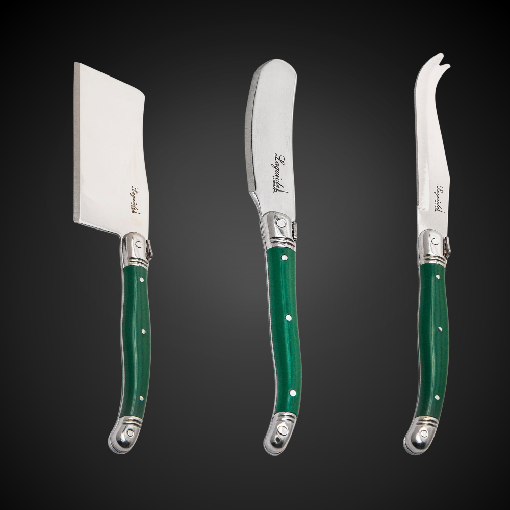 Conjunto De 3 Facas Laguiole Luxo Para Queijo Em Bandeja De Madeira, Verde