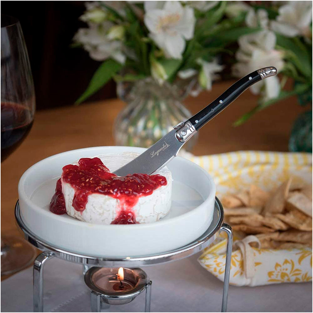 O conjunto inclui 4 facas/espátulas ideais para servir manteiga, patês ou queijos macios, e acompanha uma bandeja de madeira elegante que valoriza ainda mais a apresentação à mesa.