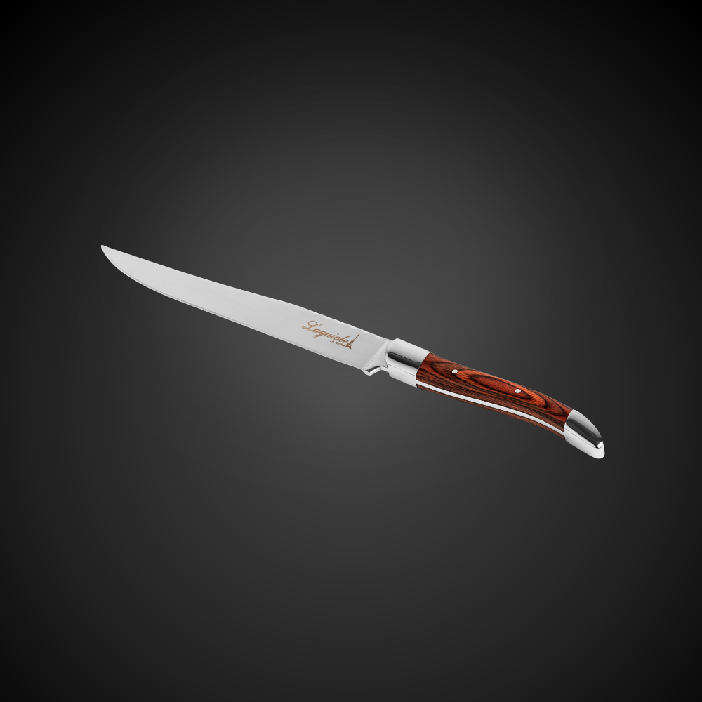 As lâminas em aço inoxidável de altíssima qualidade garantem durabilidade, resistência e um corte preciso. O elegante cabo de madeira oferece uma pegada firme e confortável, unindo beleza e ergonomia em uma peça única.