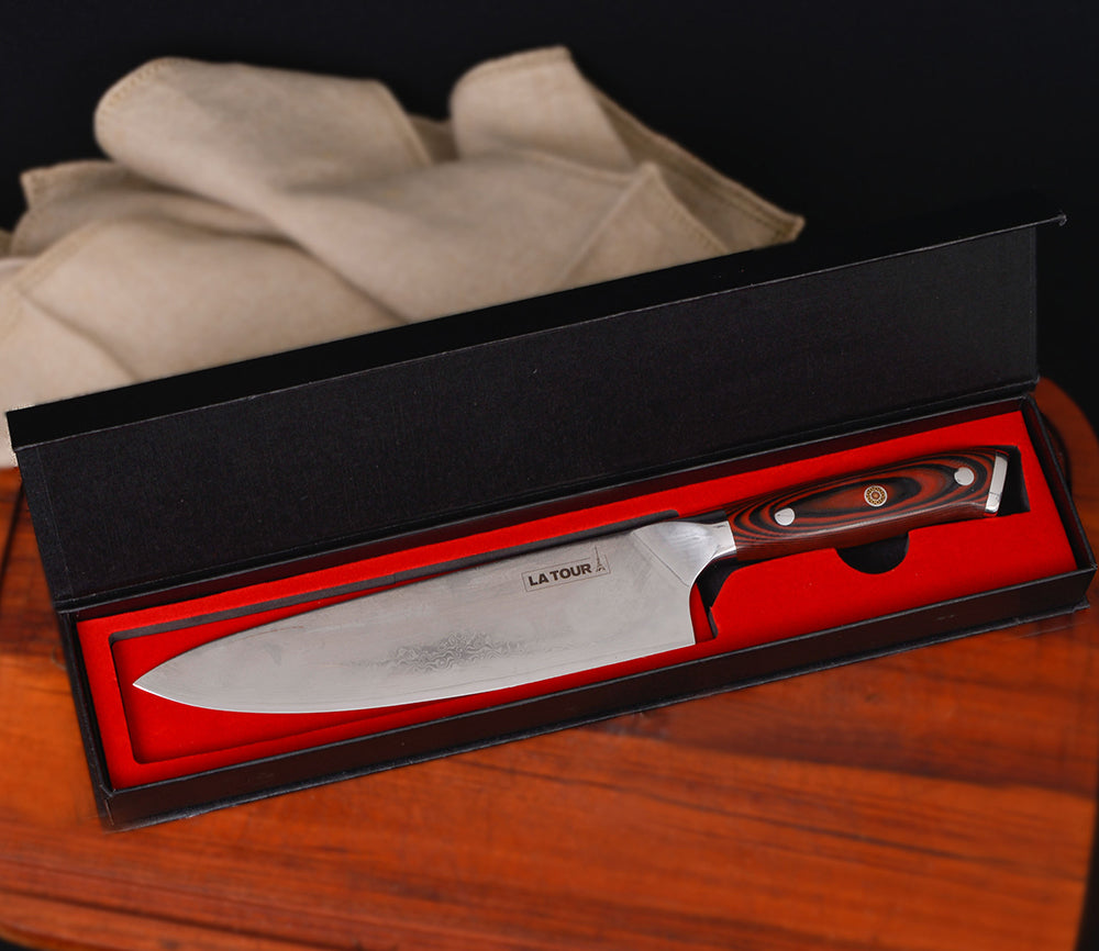 A lâmina de aço Damasco com 67 camadas de puro desempenho foi projetada para entregar um corte impecável, com máxima afiação e durabilidade do fio. Ideal para quem não abre mão de praticidade e qualidade na cozinha ou no churrasco. Com equilíbrio perfeito e ergonomia cuidadosamente projetada, essa faca garante cortes rápidos e precisos, seja em carnes, peixes, legumes ou até sushi.